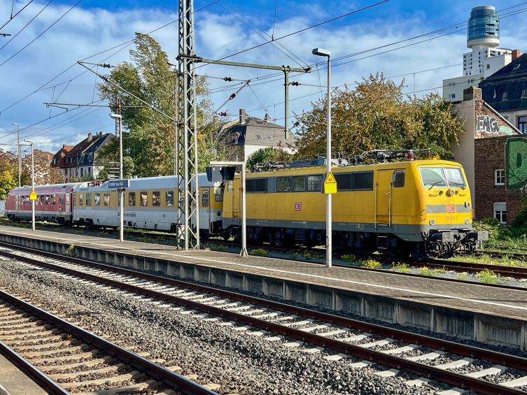 Der am 23. Oktober 2025 in Frankfurt am Main Süd fotografierte Messzug bestand aus der Lokomotive 111 059-2 des DB Maschinenpool (DBMP), dem Einheitsmesswagen