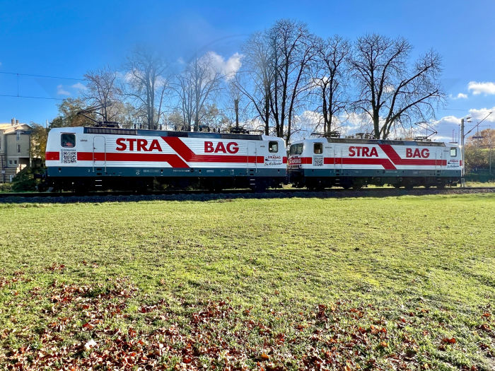 Der farbliche Gestaltung der Lokomotiven erweckt die Aufmerksamkeit der Eisenbahnfreunde und das in diesem Fall gleich doppelt. Der Eigentümer, die STRABAG Rail, ist nicht zu übersehen.